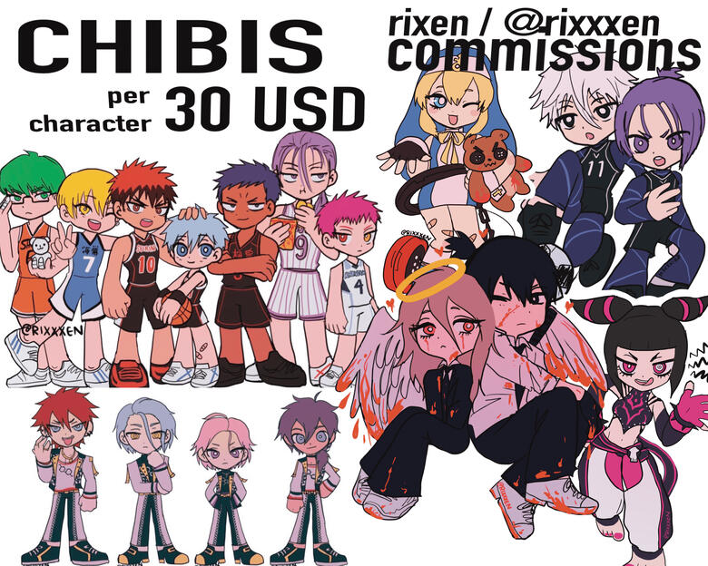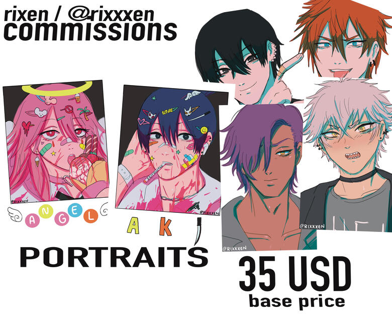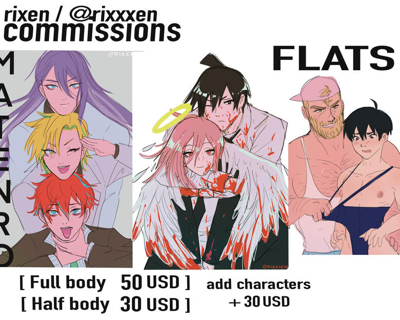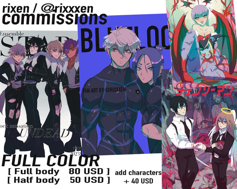Hello! Welcome to Rixen's commission info. Please read before messaging me.To see more of my work check my portfolio, twitter, instagram or pixiv (links in my banner above)